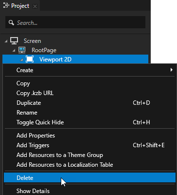 3. In the Project right-click the Viewport 2D node and select Delete to delete the node.