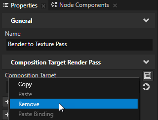 - In the Library select the Render to Texture Pass, in the Properties right-click the Composition Target property, and select Remove.