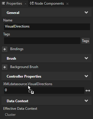 - In the Project select the Navigation > Stack Layout 2D > VisualDirections node, from the Data Sources window drag the Cluster > navigation > directions > visualdirections data object, and drop it on the XMLdatasource.VisualDirections property in the Properties.