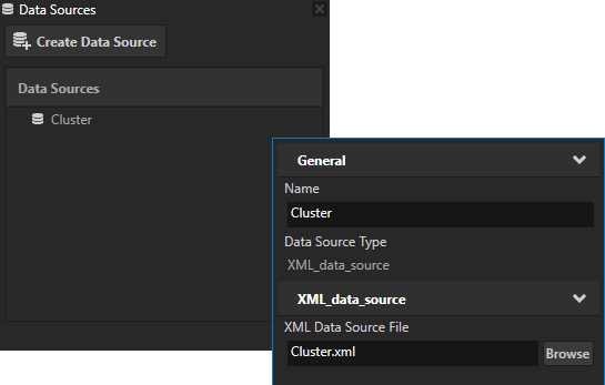 and set the XML Data Source File property to the Cluster.xml file. The Cluster.xml file is included in the Visual Studio solution in the data source plugin project. You can find the file in the Application/bin directory.