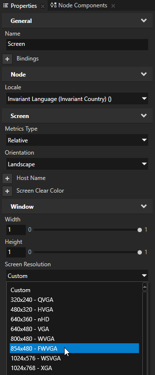 - In the Properties window set the Screen Resolution property to 854x480 - FWVGA.