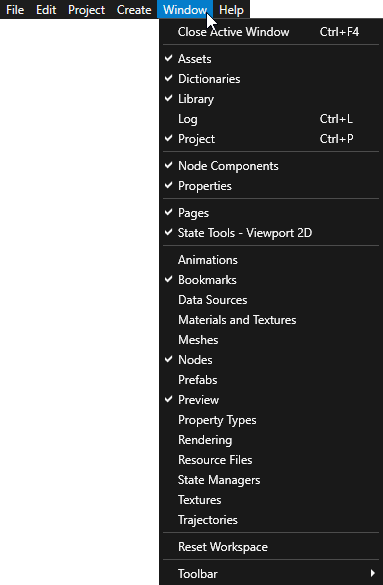 When you first create a project Kanzi Studio shows the most commonly used windows. You can find more specialized windows in the main menu. Arrange windows by moving them to the parts of the Kanzi Studio interface where you want to place them. In this tutorial you learn about the tools in the most common Kanzi Studio windows.