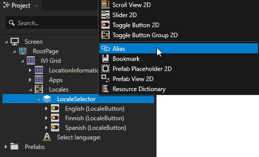 You use this alias to access the LocaleSelector node using the Kanzi Engine API and to add to the node the buttons to load the locales from the locale packs you prepare in the next section of this step.