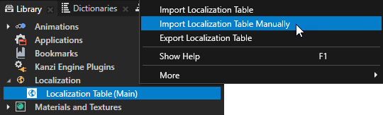 - In the Library > Localization right-click the Localization Table (Main) localization table, select Import Localization Table Manually, go to <KanziWorkspace>/Tutorials/Localization/Assets/Text, and import the ja-JP.po, zh-ZH.po, and ko-KR.po files that contain the text strings for the Japanese, Chinese, and Korean locales.