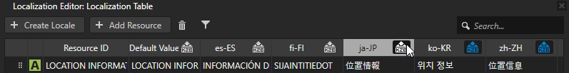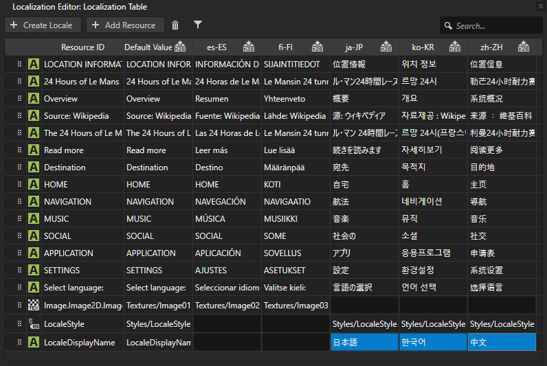 This way you mark the locales for which you want to create a locale pack kzb file that contains only the resources used by that locale. Kanzi Studio does not export to the main kzb file the resources of locales marked in the localization table as locale packs.