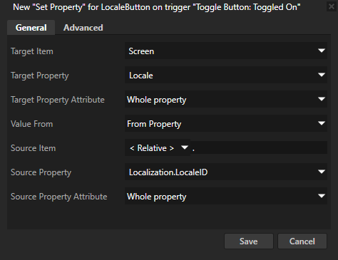 This way you get the value for the Screen node Locale property from the prefab instance used for setting the locale. - Source Property to Localization.LocaleID