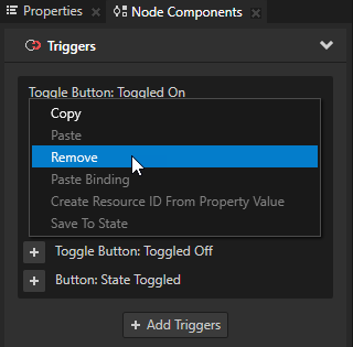 - In the Node Components right-click the Toggle Button: Toggled On trigger and select Remove.