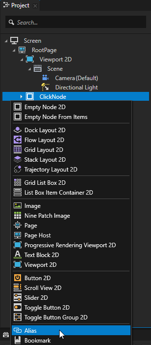 In the Projectpress Alt and right-click the node you created and select Alias. Kanzi Studio creates an alias pointing to the node from which you created the alias and adds it to the resource dictionary of its nearest ancestor node that contains a resource dictionary. Access alias target nodes using the # sign followed by the name of the alias.