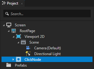 In the Project create a node for which you want to enable the click gesture. For example, create an Empty Node 2D node, name it ClickNode, and add content to the node.