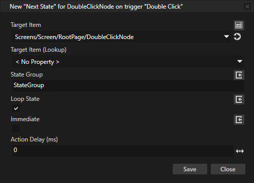 Target Item to the node which uses the state manager you created to set the appearance of a node when the Double Click trigger is set off repeatedly
