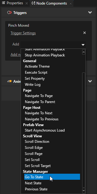 1. In the Project select the node to which you want to add the trigger, and in the Node Components > Triggers section add one of the Pinch Manipulator triggers.