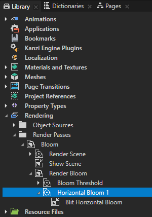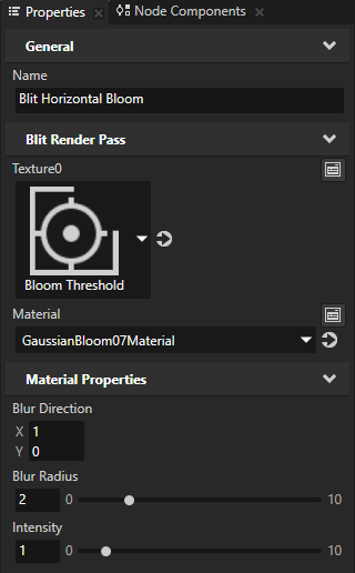 - In the Library select the Vertical Bloom 1 > Blit Horizontal Bloom render pass and in the Properties set: