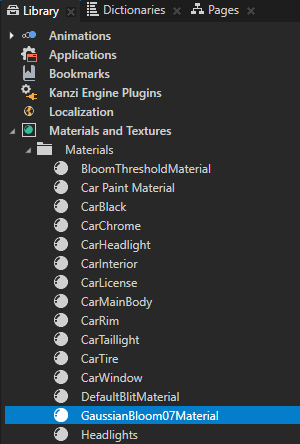 - In the Library right-click Materials and Textures, select Load Material Type From Disk, go to <KanziWorkspace>/Tutorials/Bloom/Assets, and load the GaussianBloom07.kzmat material type.