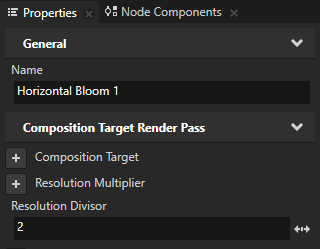 - In the Library select the Horizontal Bloom 1 render pass, in the Properties add the Resolution Divisor property, and set it to 2.