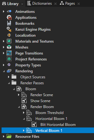 - In the Library duplicate the Horizontal Bloom 1 render pass and rename the new render pass to Vertical Bloom 1.