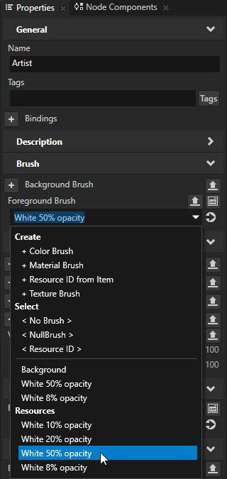4. In the Prefabs > Music select the Artist node and in the Properties set the Foreground Brush property to the White 50% opacity color brush of the Resources project.