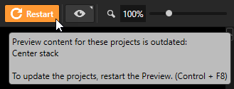 When the project that Kanzi Studio shows in the Preview or any of the referenced projects contain changes that you have not yet exported to the kzb files of the projects, in the Preview the Restart button is orange.