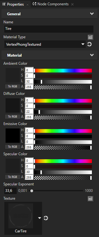 - In the Library > Materials and Textures > Materials select the Tire material and in the Properties set:
