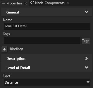 - Distance to create a Level of Detail node that shows its child nodes based on the distance between the Level of Detail node and the preview camera.
