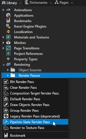 - In the Library > Rendering > Render Passes press Alt and right-click and select Pipeline State Render Pass, or select an existing Pipeline State Render Pass. See Render passes.