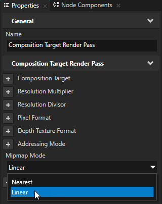- In the Library > Rendering > Render Passes select the Composition Target Render Pass, in the Properties add the Mipmap Mode property, and set it either to Linear or Nearest. See Filtering textures.