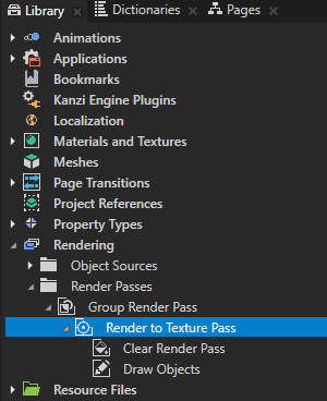 - In the Library select the Render to Texture Pass that you created, in the Properties click