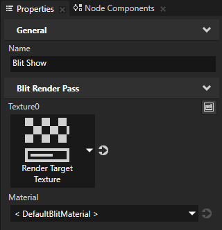 - In the Library > Rendering > Render Passes > Gaussian Blur create a Blit Render Pass, name it Blit Show, and in the Properties set the Texture0 property to Render Target Texture.