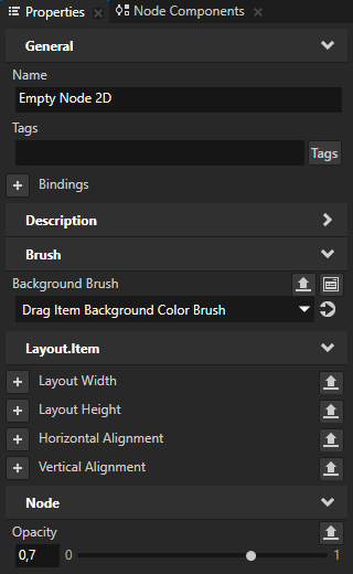, select Empty Node 2D, name it Drag Item, inside it create an Empty Node 2D node, and in the Properties add and set: