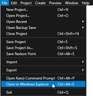 To open the directory of a Kanzi Studio project from Kanzi Studio, select > Open in Windows Explorer.