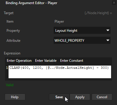 CLAMP(400, 1200, {@../Node.ActualHeight} - 300)Click Save.Clamp() binding function to constrain the height of the Player node: