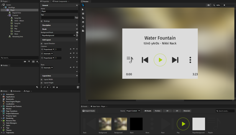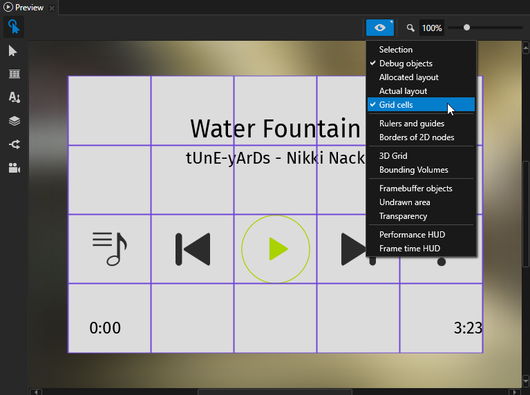 User interfaces with dynamic layout respond to changes in device screen orientation and resolution. Grid Layout nodes form the base of dynamic layouts. To make your Kanzi application layout dynamic, you have to place inside Grid Layout nodes all content for which you want that it responds to the changes in the screen resolution. Then you set up the Grid Layout nodes so that they position and distribute the content the way you want.