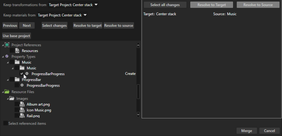 - In Kanzi Studio open the Center stack project, in the Library > Project References right-click the Music project reference and select Merge Project.
