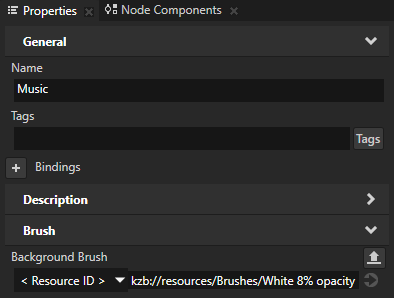 - In the Prefabs select the Music prefab and in the Properties set the Background Brush property to < Resource ID > and in the text box paste the kzb file URL you copied in the previous step.