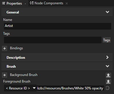 - In the Prefabs > Music select the Artist node, in the Properties set the Foreground Brush property to < Resource ID >, and in the text box paste the kzb file URL you copied in the previous step.