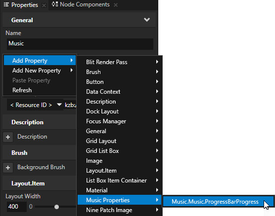 - In the Project select the Music prefab, in the Properties right-click and select Add Property > Music Properties > Music.Music.ProgressBarProgress.
