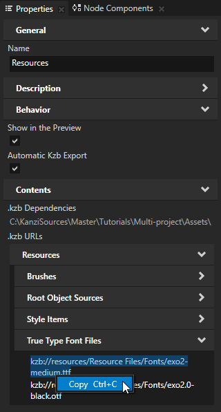 - In the Library > Project References select the Resources project and in the Properties copy the kzb file URL of the Exo 2 Medium font.
