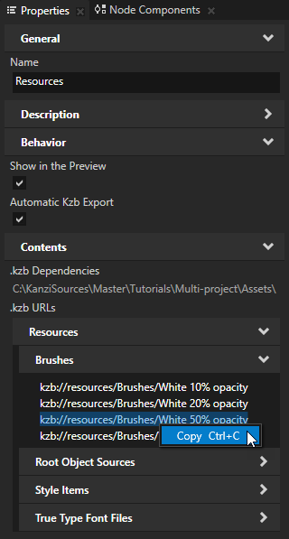 - In the Library > Project References select the Resources project and in the Properties in the Resources project Brushes category copy the kzb file URL of the White 50% opacity Color Brush.