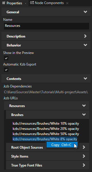 - In the Library > Project References select the project reference you created in the previous step and in the Properties in the Resources project Brushes category copy the kzb file URL of the White 8% opacity Color Brush.