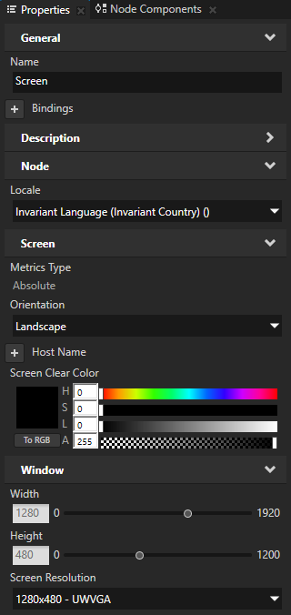 - In the Project select the Screen node and in the Properties set the Screen Resolution property to 1280x480 - UWVGA.
