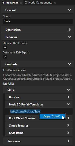 - In the Properties in the .kzb URLs property in the section of the Stats project expand the Node 2D Prefab Templates category, double-click the kzb file URL of the Stats prefab, right-click, and select Copy.