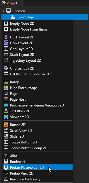 - In the Project press Alt and right-click the RootPage node, select Prefab Placeholder 2D, and name it Stats.