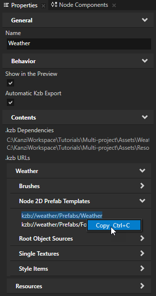 - In the Library > Project References select the project reference you created in the previous step and in the Properties in the Weather project Node 2D Prefab Templates category copy the kzb file URL of the Weather prefab.