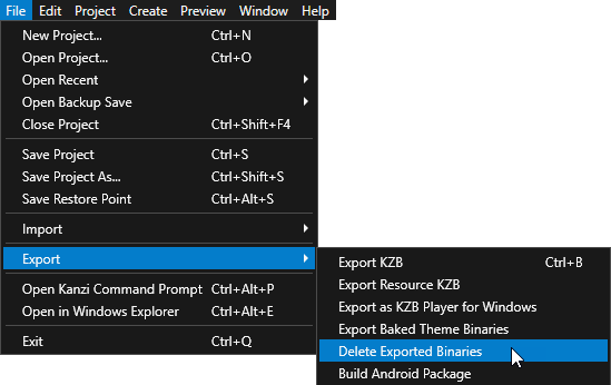 When you want to permanently remove all kzb files exported from a project select > Export > Delete Exported Binaries.