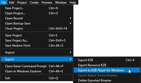 - In Kanzi Studio select > Export > Export as KZB Player for Windows and open the .exe file of the application in the <ProjectName>/Tool_project/Application Player directory.