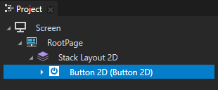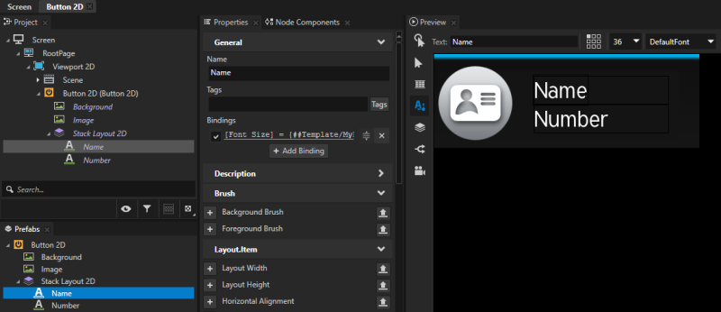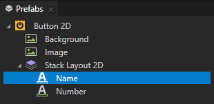 For example, create a Button 2D prefab, and add an Image and a Text Block 2D node to it.