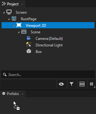 When you drop a node into the Prefabs window, Kanzi Studio creates a prefab template from the node and replaces the original node with an instance of the prefab.