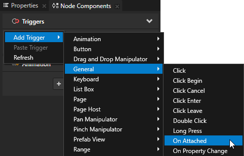 For example, add the On Attached trigger to start loading resources when Kanzi attaches the Prefab View node to the screen graph.
