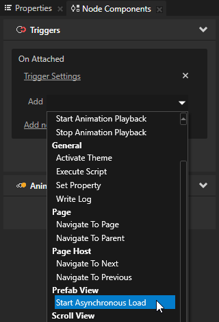 - In the Project select the Prefab View node, in the Node Components > Triggers section right-click and select Add Trigger > Prefab View > Asynchronous Load Completed.