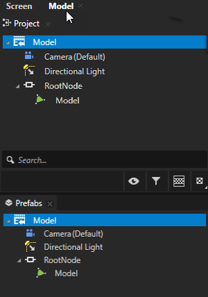 In the Prefabs a new Scene prefab named after the imported file. In that Scene prefab Kanzi Studio creates the node hierarchy from the imported file and references the resources used by the nodes from the library.