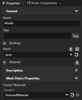 In the Prefabs select the Model node, in the Properties add the Bindings property, and in the Binding Argument Editor set: